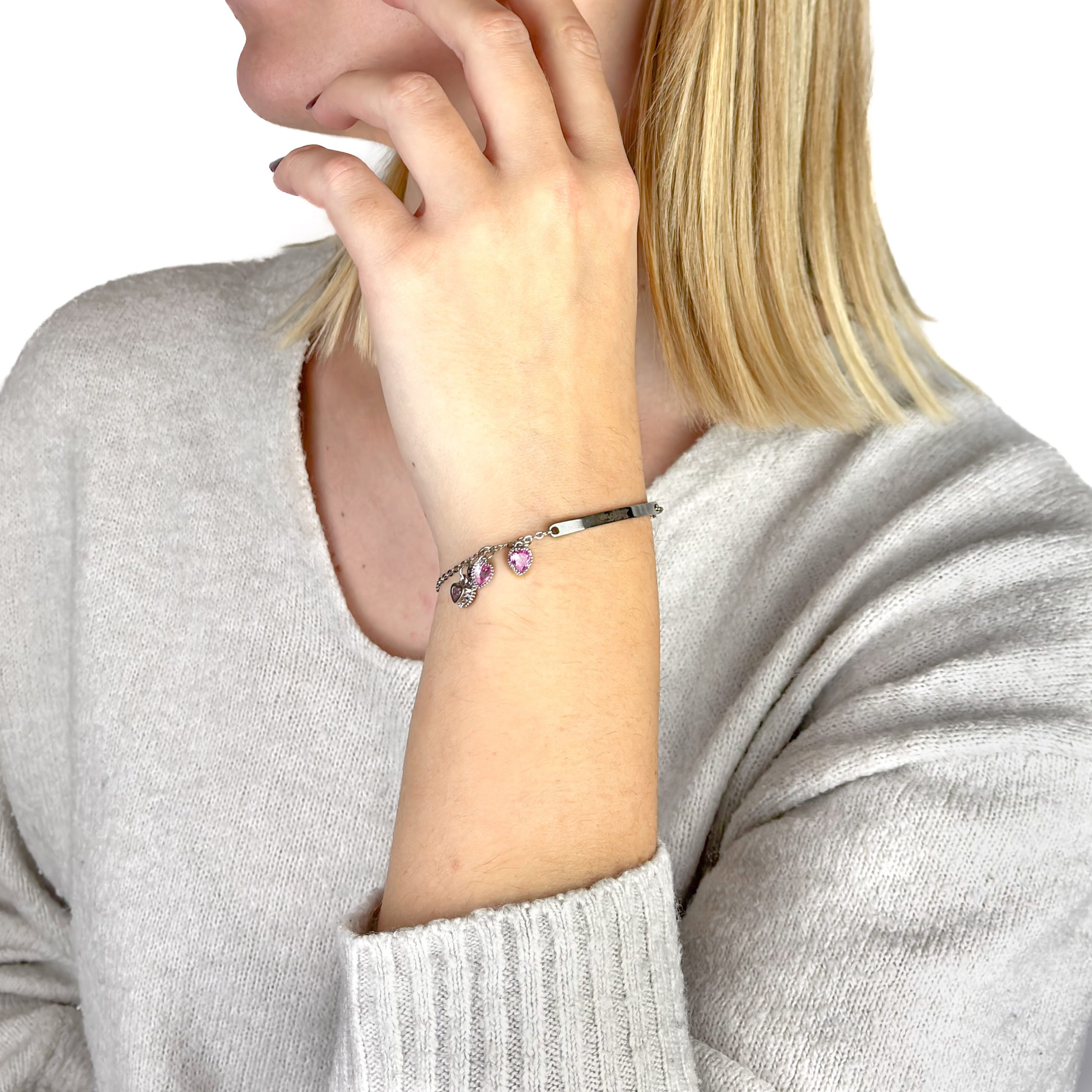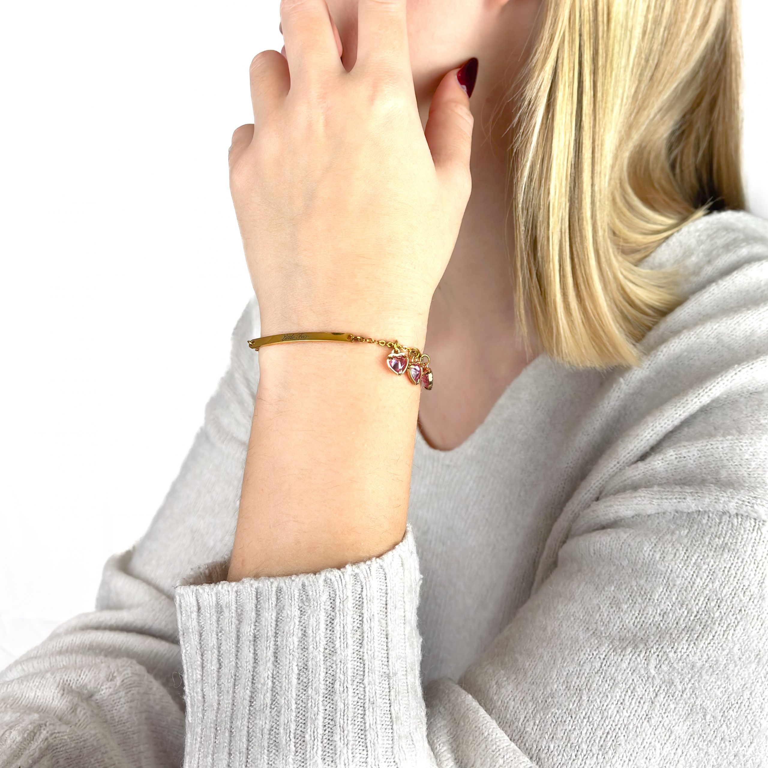 At its center lies a polished plate engraved with Little Fox. It is a tribute to Evangeline’s nickname and her quiet strength. Beside it, three pink crystal hearts shimmer softly, adding a touch of light and magic. Together, these charms remind you that even fragile hope can shine brightly in the dark.
